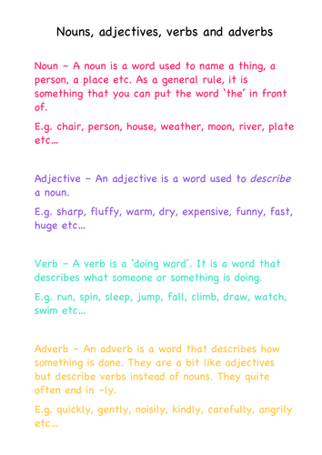 Verb noun adjective adverb preposition. Yummy, delicious, tasty, sweet, bitter, sour, salty, slippery, slimy, spiky, prickly, smooth, rough, sticky, soft, hard, wet, dry, furry, sad, happy, funny. (the adverb badly describes the verb slept.) linking verbs. Learn how to recognize nouns, verbs, adjectives, and adverbs in this important basic grammar lesson. An adjective is a word or set of words that modifies (i.e., describes) a noun or pronoun.